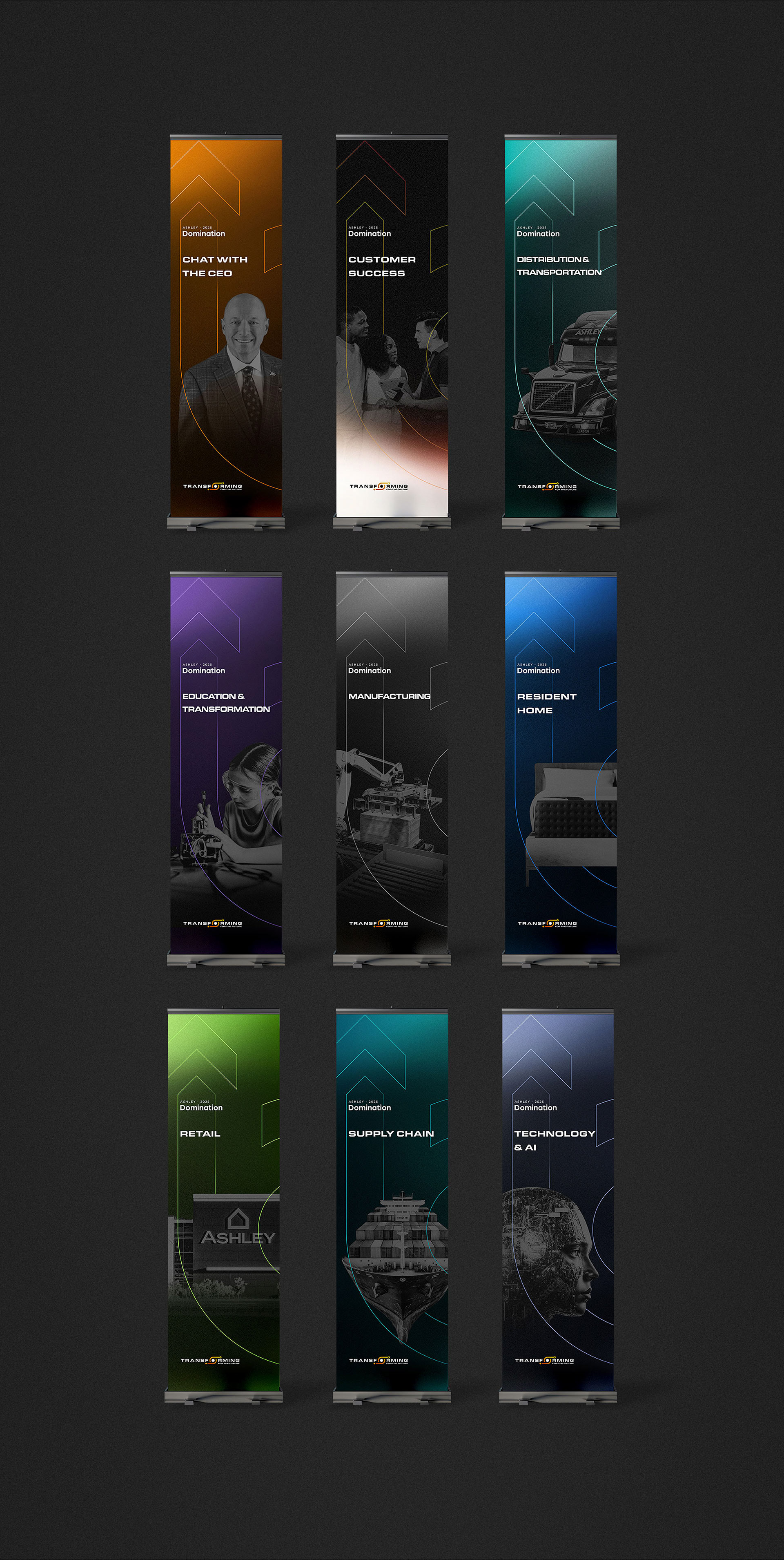 For Ashley Furniture’s 2025 internal leadership conference, Ashley Domination, I spearheaded the creation of a forward-looking brand identity centered on the theme “Transforming for the Future.” Drawing from ideas of progress, innovation, and adaptability, I crafted a visual system that embodied transformation in both form and meaning. The logo marks, typography, color palette, iconography, and supporting patterns were designed to convey energy in motion—symbolizing growth, reinvention, and the continuous pursuit of excellence. This cohesive branding not only captured the spirit of the conference but also served as an inspirational framework, guiding attendees to envision and embrace their own path toward future-focused leadership.