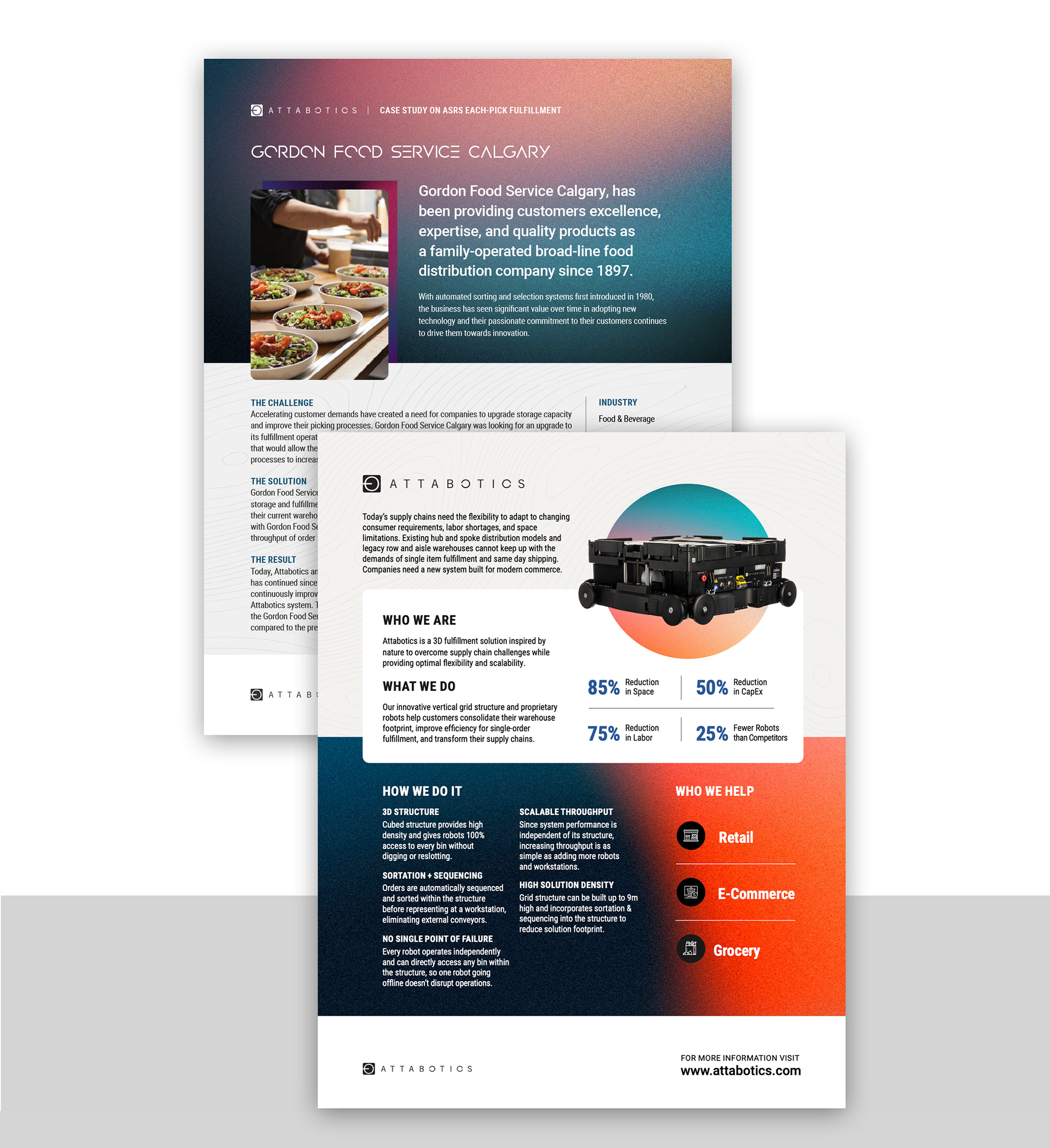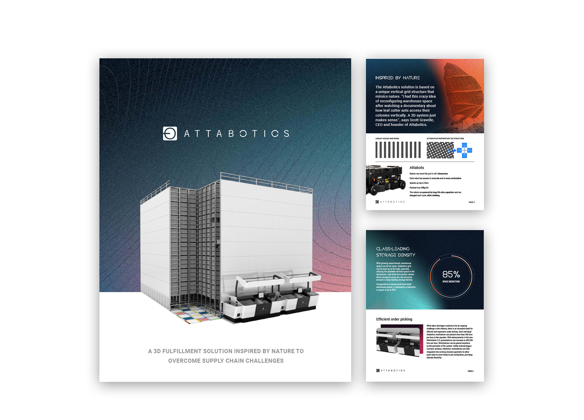At Attabotics, a robotics and supply chain technology company specializing in innovative 3D automated warehouse systems, I developed flyers, one-sheets, report layouts, and social graphics that translated complex automation solutions into clear, compelling marketing and communications materials for internal and external audiences.